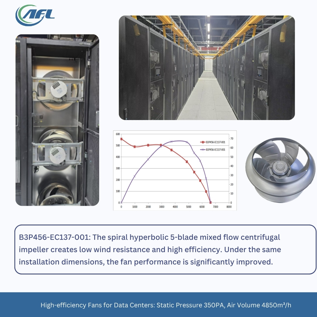 High-Efficiency EC Fan Solutions for Data Centers — Precision Cooling, Reliability, and Energy OptimizationOctober 24, 2025Data centers worldwide demand cooling systems that combine high airflow efficiency, stable static pressure, and quiet, continuous performance. AFL Motor provides high-efficiency EC centrifugal fans engineered for in-row cooling units and precision air conditioners, enabling optimal PUE performance and extended uptime. The flagship model B3P456-EC137-001, a backward-curved EC centrifugal fan, delivers high static pressure with low power consumption and intelligent control interfaces. Supported by ≈80 % automated manufacturing, ISO 9000 process discipline, and in-house aerodynamic validation, AFL ensures each fan meets mission-critical reliability standards. Modular integration and long-life bearings minimize maintenance while enhancing system stability for modern server environments.